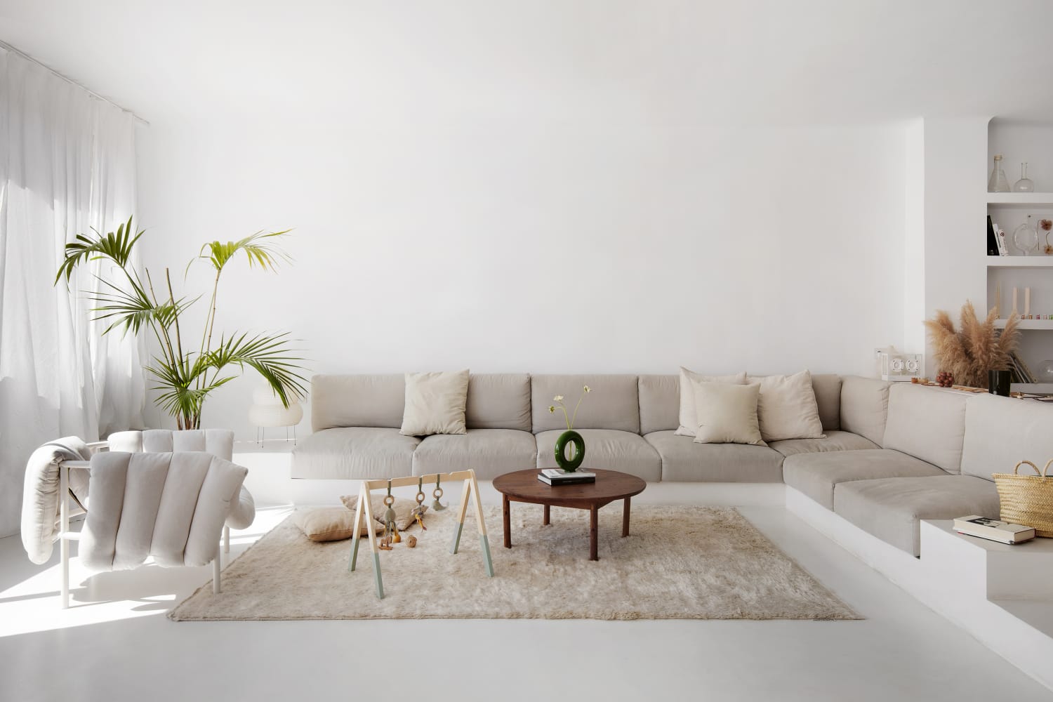 Once the space was clear, they began to think about how they intended to use the spaces. The concept was to create a Mediterranean-inspired home, as if it were a large covered terrace with big plants and a built-in sofa with custom-made cushions. Valeria needed a place to display her pieces and a workspace, which is why they decided that the area of transition between the social and private areas would be hers. They love to have breakfast in the sun, so the idea of where to put the big, open kitchen was determined by the corner that gets the most morning light. And finally, with the arrival of their two little girls, the apartment transformed from a minimal well-designed loft to a warm space full of light, where the two girls can move and play freely.