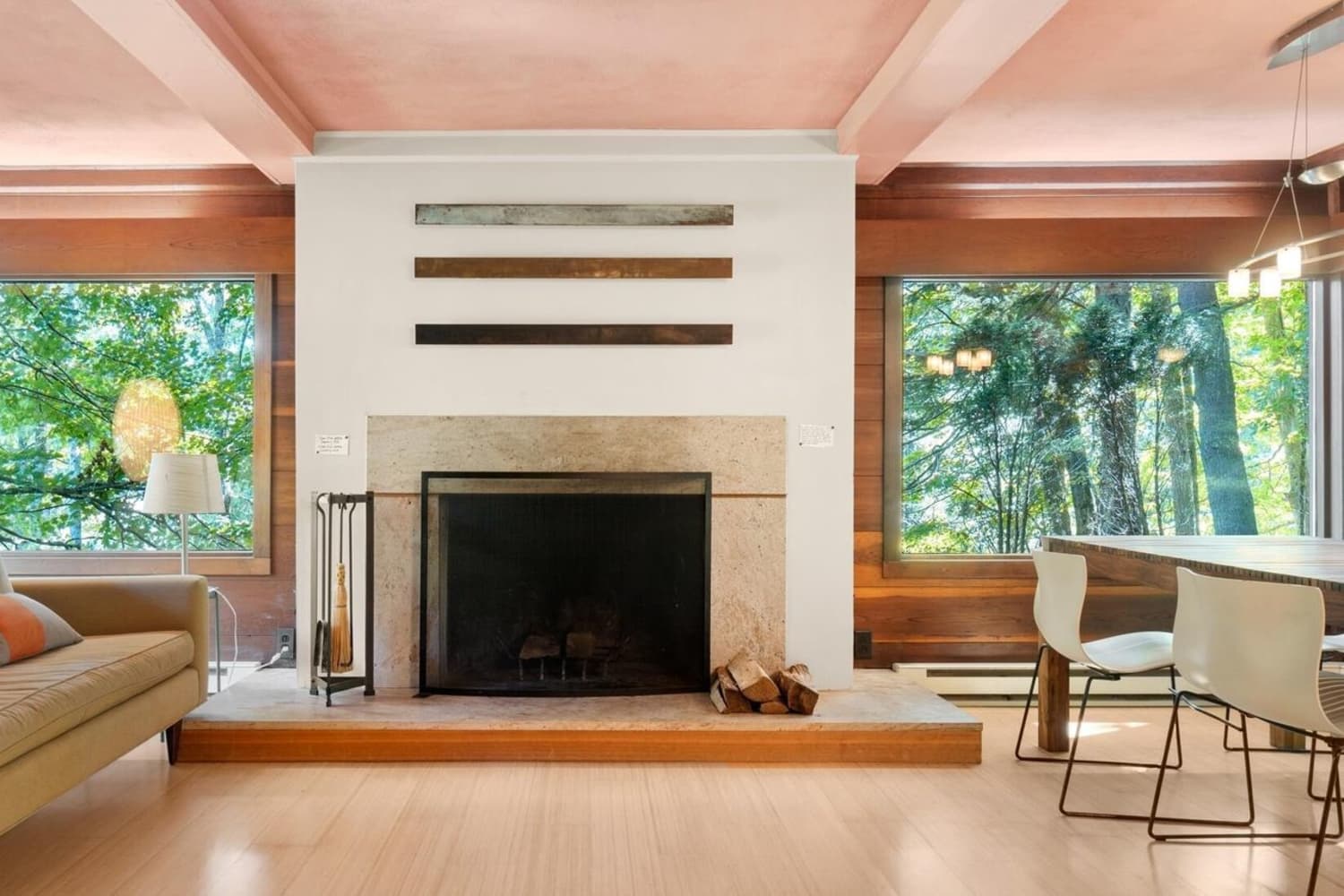 If only this home had big windows to appreciate the changing leaves from inside. Oh wait! It very much does. Its mid-century modern design prioritizes bringing the outdoors in, and keeps the interior beautifully simple. Pale wooden floors, an elegant mantle-free fireplace, and warm paneled walls give the living room an elevated cabin feel. Wide windows look directly into the surrounding trees, making it look like you’re living in a treehouse. From the bottom of the sloping hill it sits on, the low-profile home is a wooden rectangle with a red front door all but ensconced by the surrounding nature which is mere weeks from bursting into a kaleidoscope of autumn colors.