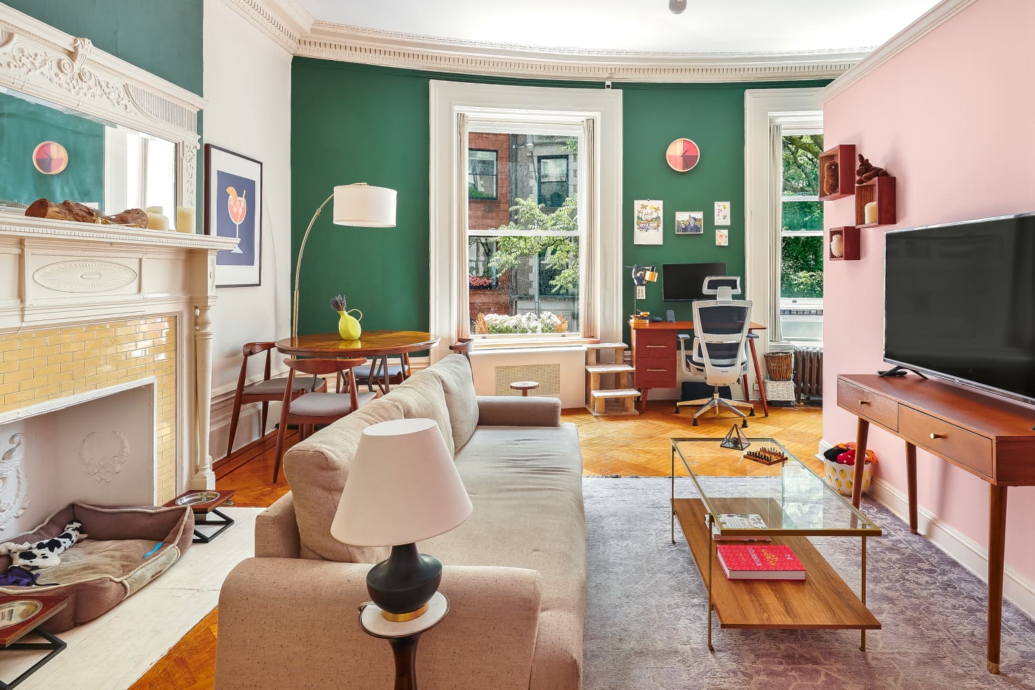 Favorite Element: Our favorite element of the apartment is the dark green wall with the two windows overlooking the beautiful brownstones and tree-lined street. Each window has a beautiful frame so we wanted to make each window pop like a work of art by painting the wall dark green. We bought beige curtains that fit perfectly inside the frame so they would blend into the background.