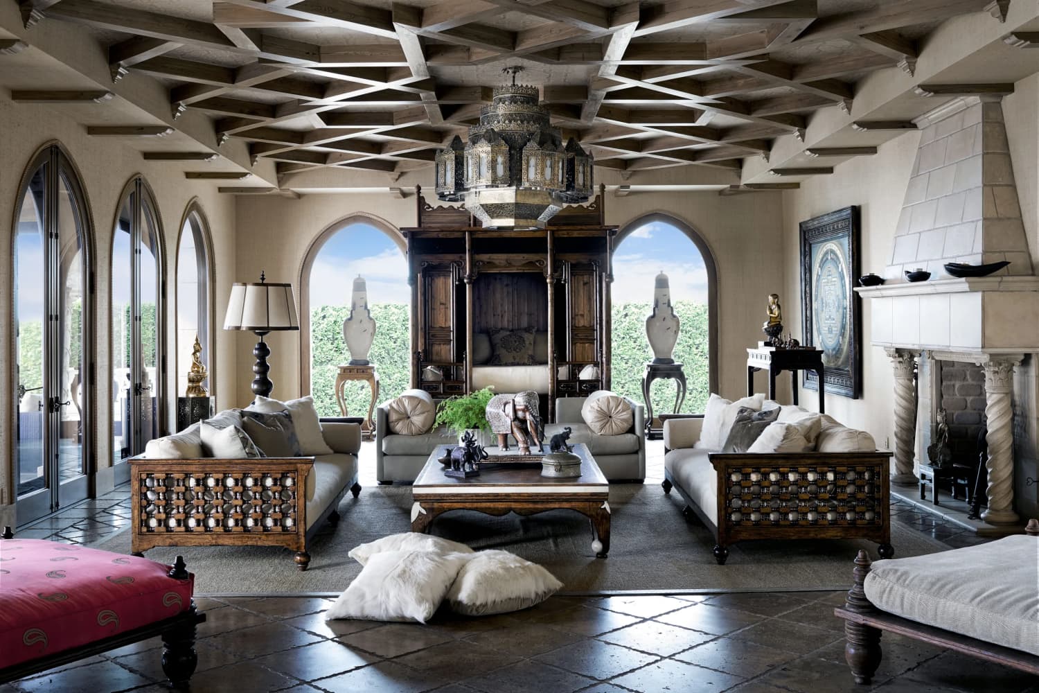Outside the 16,000-square-foot mansion, a pair of vintage bronze bulls, inspired by Cher’s astrological sign (Taurus) sit outside the entrance next to her Bentley. In the grand entrance, limestone block walls, custom bronze doors, and carved panels from India provide an exotic welcome. In the central courtyard, an octagram-shaped fountain is surrounded by inspiration derived from Venetian palazzos, Renaissance villas of Europe, and the Alhambra palace. The sun beams down on the space under palm trees.