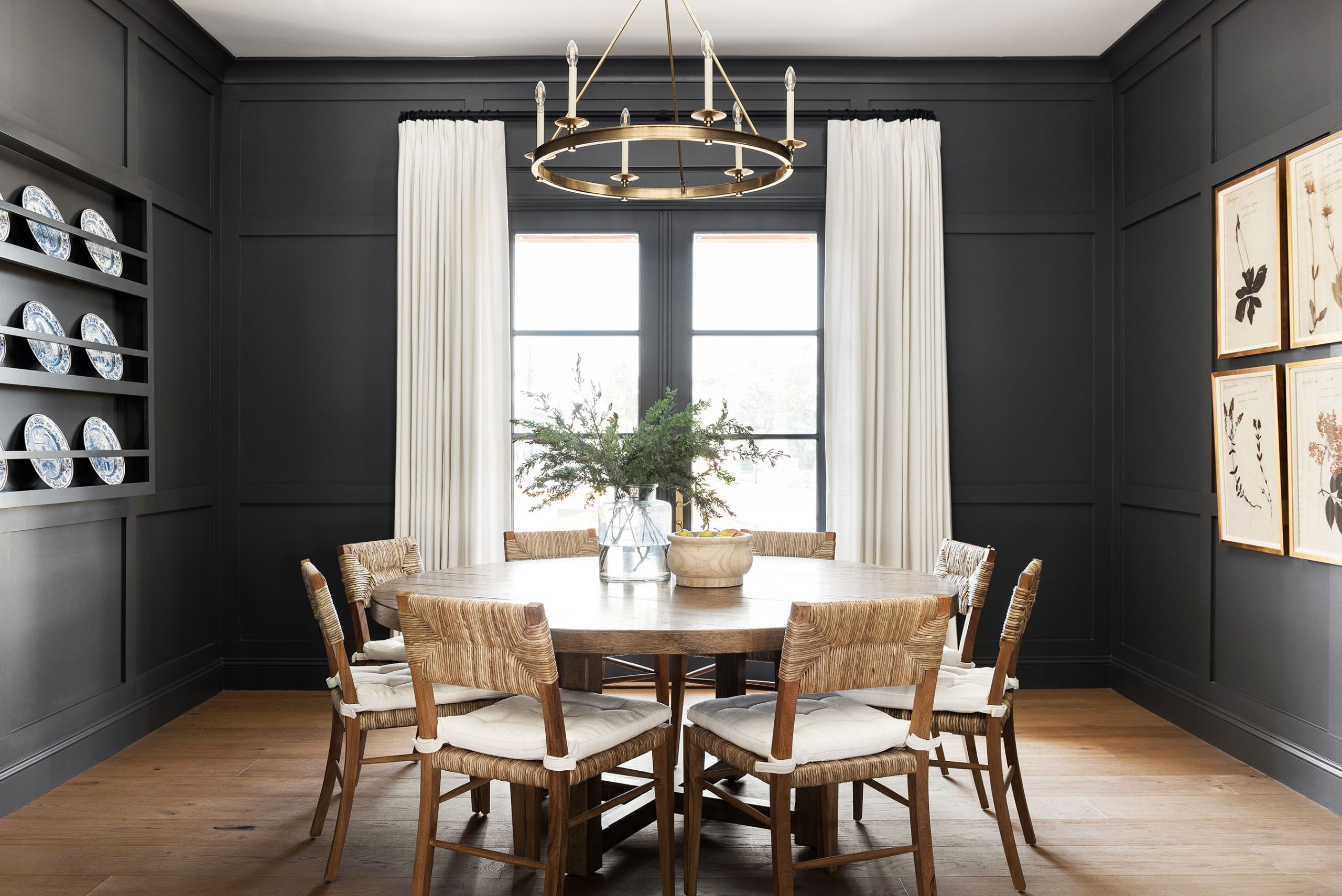 Look no further for moody inspiration than Studio McGee’s own, Syd McGee. His office space in our Studio McGee headquarters is nearly all dark-on-dark with a patterned rug, wood desk, and deep shades for all the fixtures. Tonal black curtains meld seamlessly with the painted walls.