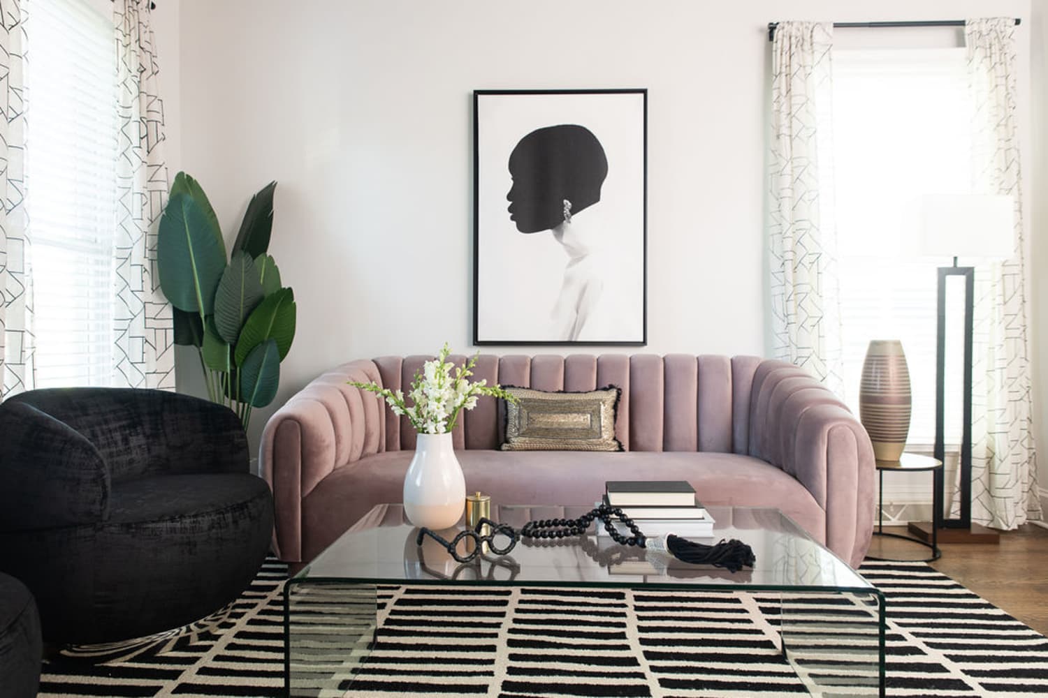 Artwork, pops of pattern, and paint in particular all play starring roles in the home. “We used all Sherwin-Williams products and colors,” says Cloud. “Each room was strategically selected to create playful contrast with hints of bold saturation.” For example, she had the living area walls coated in Eider White (SW 7014), and it sits perfectly next to the renovated fireplace coated in Black Magic (SW 6991). Cloud also incorporated that same black hue on the ceiling of the “she cave,” which has Modern Gray (SW 7632) walls and centers on a curved channel-back lilac sofa that’s meant for sinking into and relaxing.