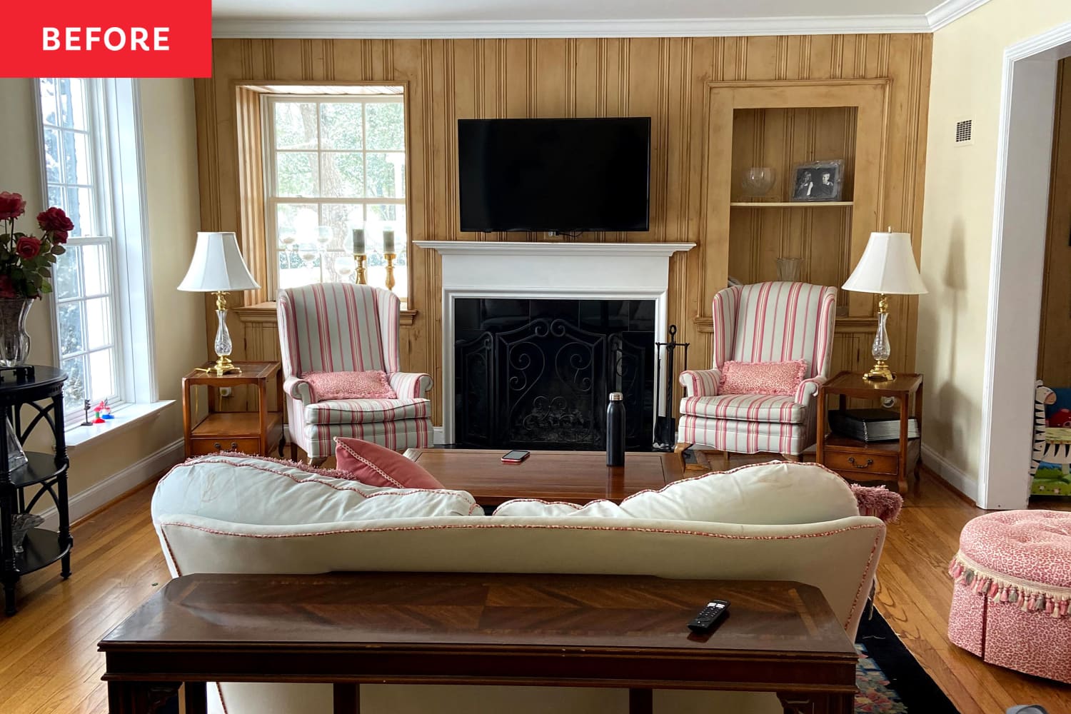 See How a Stager Transformed a Wood-Paneled Living Room into a Cheerful Hangout