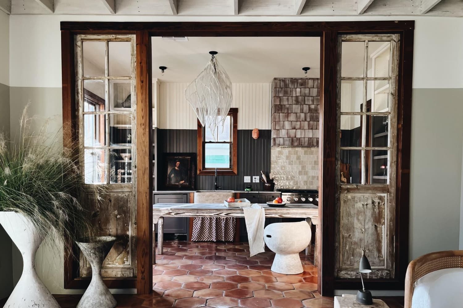 The entire home subs hardwood floors for Saltillo tiles sourced from Mexico, which sets a warm, terracotta-colored foundation for the rest of the interior. In the living room, exposed wood beams adorn the ceiling and an understated antique milk glass light fixture hangs from the center. That room flows into the kitchen, where an eclectic mix of tones and textures — from gray-and-white walls to leathered marble counters — make the space feel like it’s aged gracefully through several iterations, despite its pristine condition.