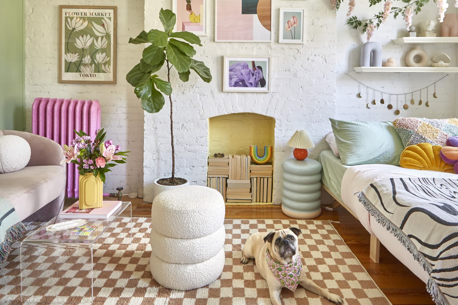 Maitri Mody‘s NYC apartment is chock-full of color and quirky design choices, but her favorite spot is actually the same as her pug Ari’s. The bed next to the bay window is their favorite spot to watch airplanes at night, see the pink-orange sunrise, and people watch over the street and tennis court below.
