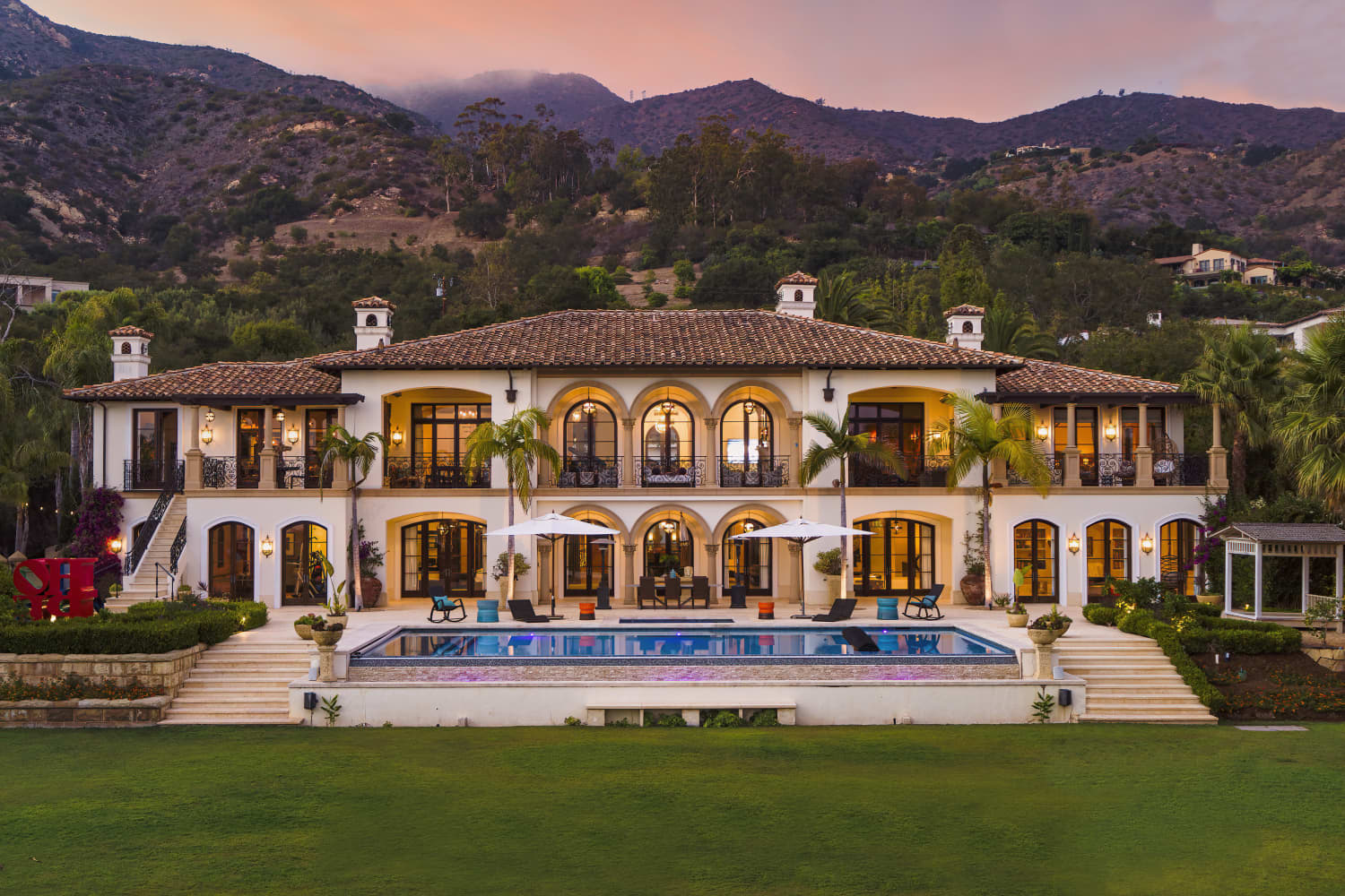 The estate spans 13.5 sq. ft. and is fully equipped for both large, lavish events and small, intimate gatherings. A neutral color palette and contemporary furnishings dominate the bedroom designs, while exposed beams and vintage-style decor gives the open-plan kitchen and living area a cozy, lived-in feel. Kitted out like a five-star luxury resort, amenities include a gym, theater, bar, game room, pool, sauna, library, and a five-car garage. The property also includes a tranquil guest house surrounded by lush gardens, complete with a separate private entrance that allows guests to feel like they have arrived at their very own home away from home.