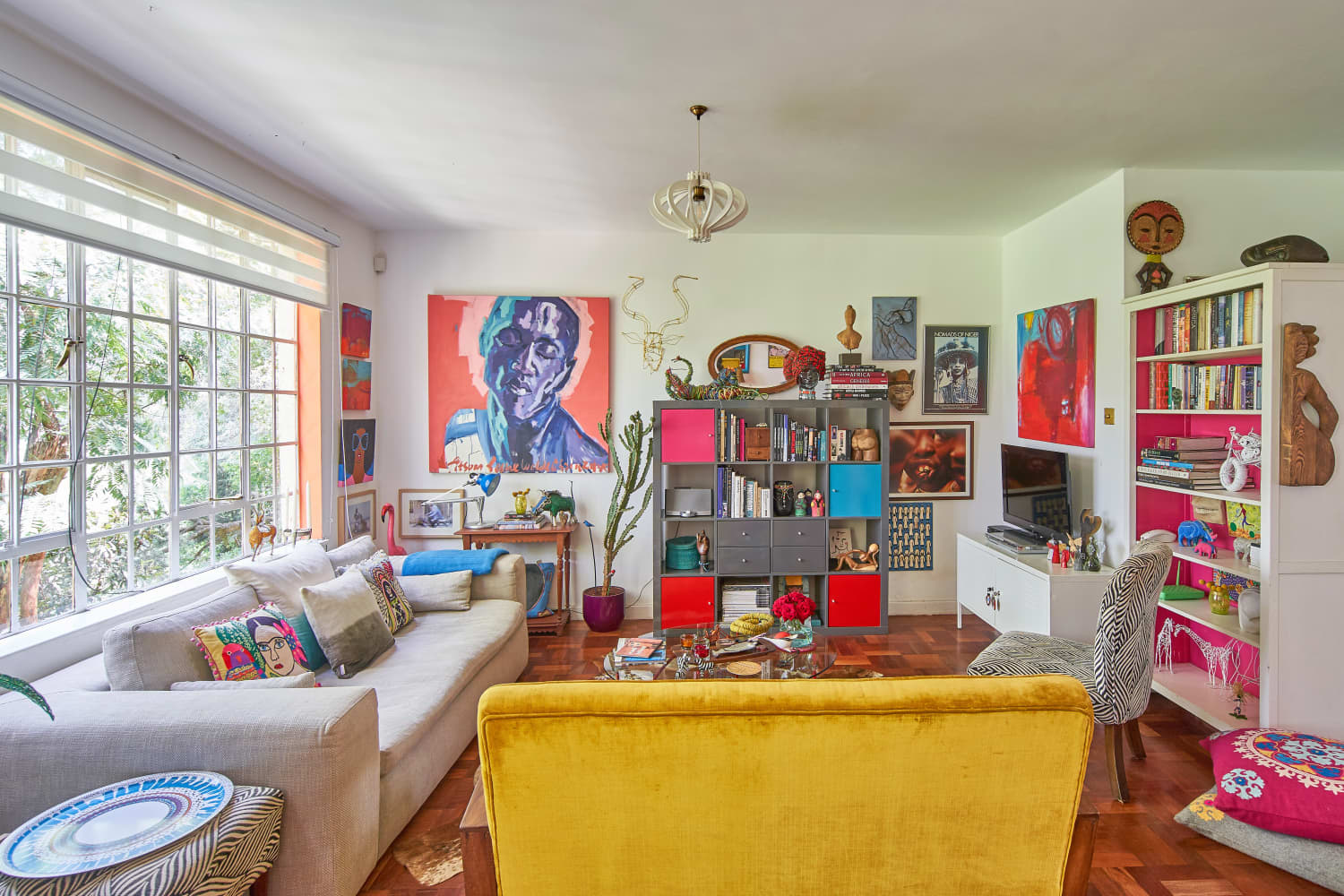 Hepworth’s studio and Ash Appleton’s Nairobi, Kenya, apartment both use yellow couches as building blocks in kaleidoscopic rooms filled with vibrant wall coverings, furniture, and decor.