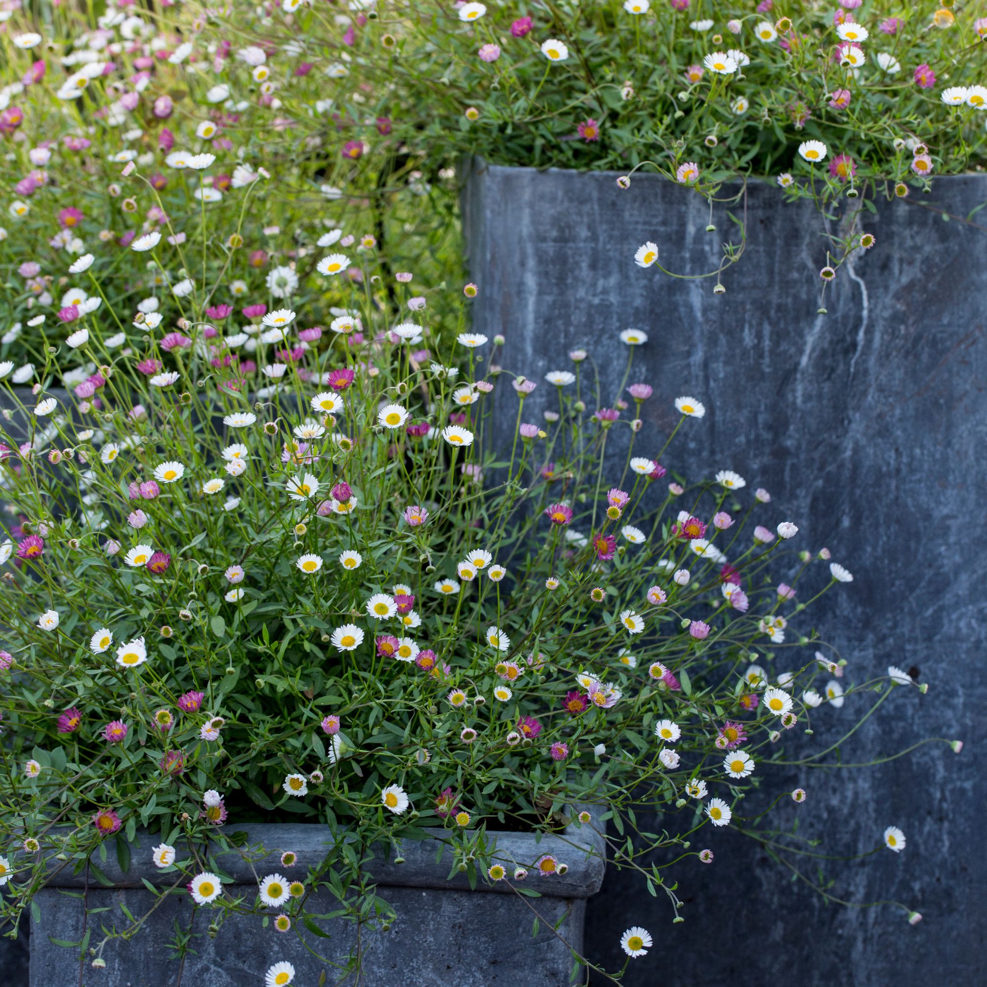 We’ve just discovered an easy way to level up our garden pots on a budget: fill them to the brim with Erigeron.
