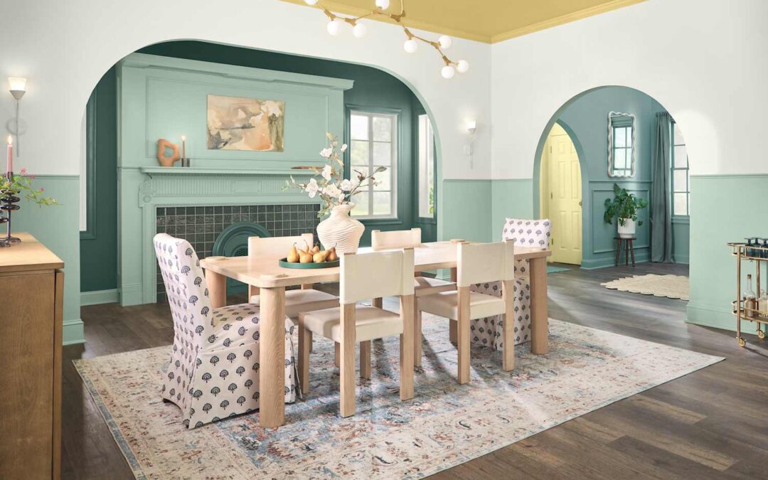 Finally, Ashley McCollum, color marketing manager at Glidden, recommends pairing a darker, almost twilight-toned blue with a more subdued green — namely, PPG’s Annapolis Blue and Dill — for a combination that feels unexpected but not overpowering.