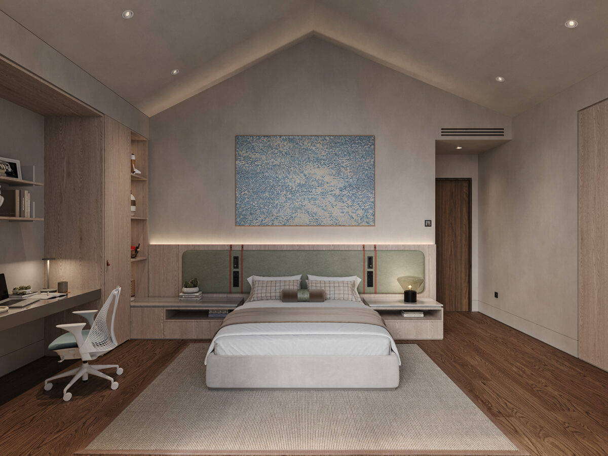 This bedroom feels calm and collected, yet full of character. The muted palette of soft greys, greens, and natural wood creates a soothing backdrop; the textured headboard with leather accents adds craftsmanship. Built-in shelves and a sleek desk make the space practical without sacrificing style. The artwork above the bed ties everything together with a gentle splash of color.