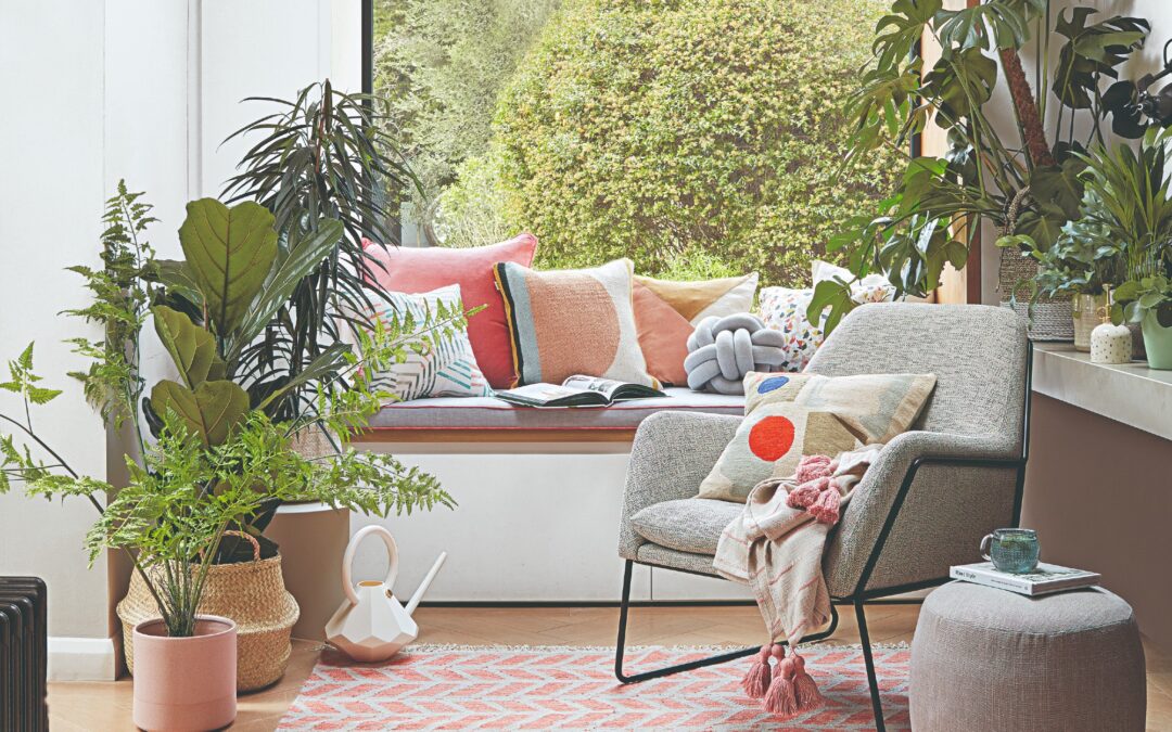 A living room with a large window, a window seat and houseplant, all tied together with a patterned rug