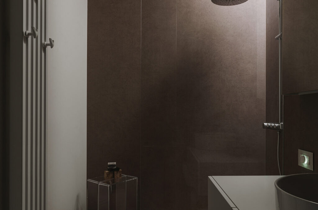 The bathroom takes the apartment’s calm geometry in a richer direction. Deep brown wall panels warm the space instantly. The forms stay simple with smooth surfaces. A crisp white basin and integrated storage add just the right amount of contrast.
