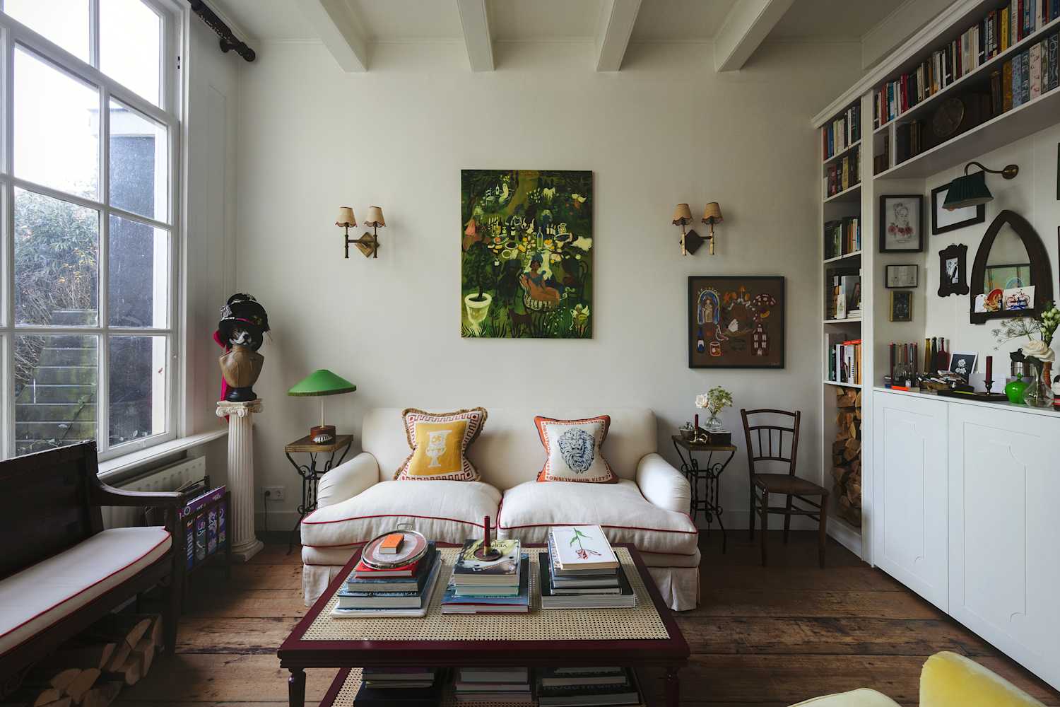 Small details finish it off: a slim brass reading sconce, the sculptural side table, and the arched built-in shelving.