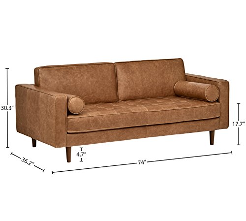 Details: This sleek, mid-Century inspired leather sofa is designed to impress. A tufted bench seat cushion, plush back cushions, tapered wood legs, and tidy bolster pillows provide just the right mix of comfort and contemporary edge.