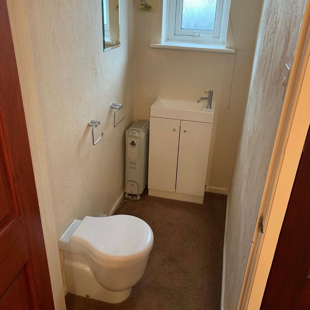 This brown carpeted bathroom has been transformed into a swoon-worthy cloakroom